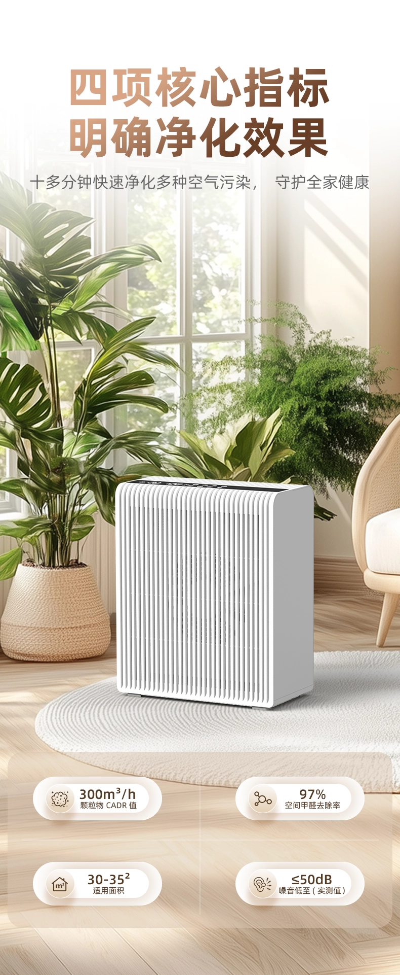 Create a healthier, more productive workspace with our commercial-grade Air Purifier, designed for offices, co-working spaces, and small commercial areas. With a CADR of 300m³/H and a coverage area of 35-40㎡, it rapidly circulates and purifies air, removing dust, odors, mold spores, cigarette smoke, and VOCs.