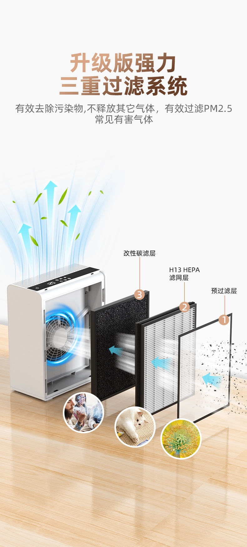 • 3 in 1 filters:Pre-filter & H13 HEPA filter& Activated carbon filter