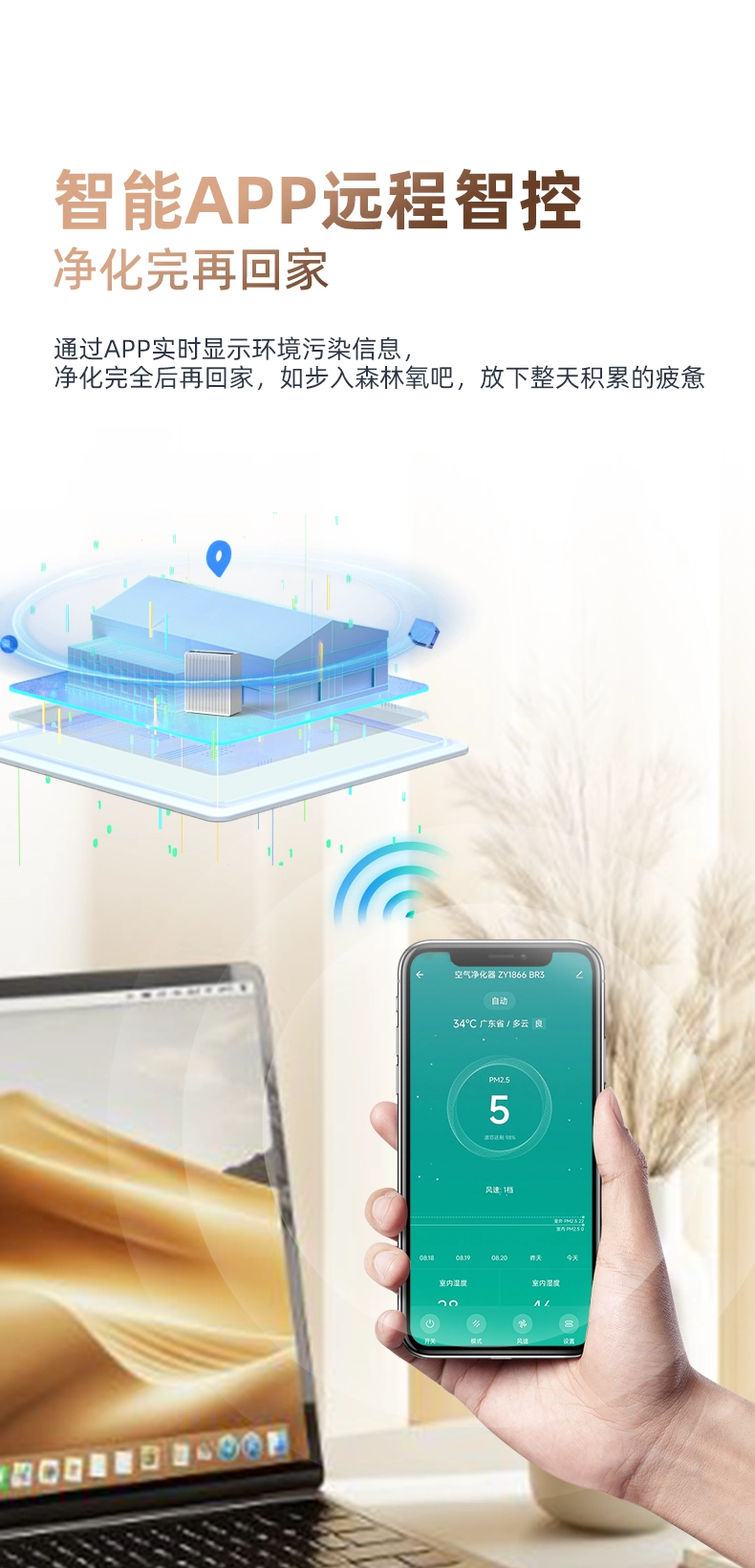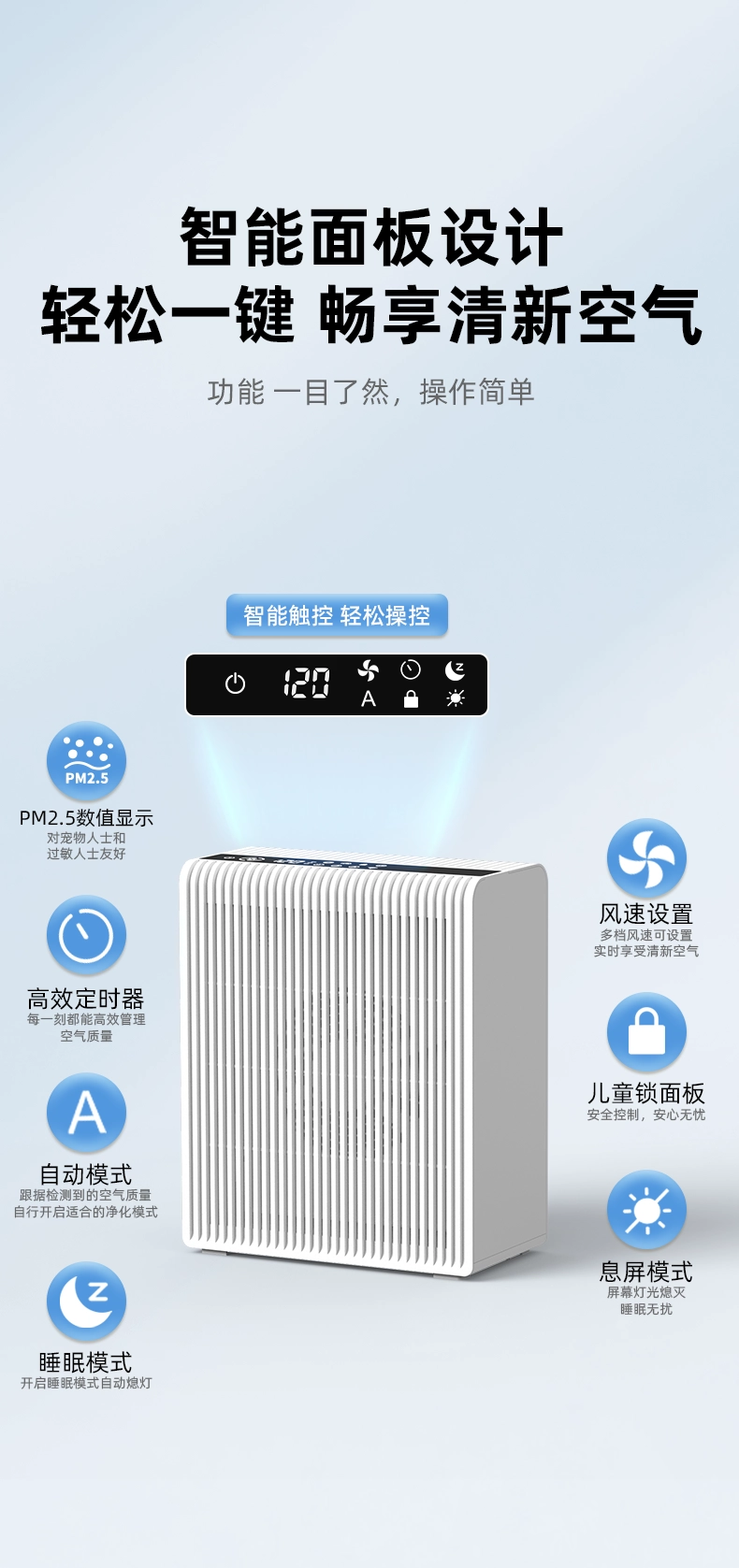 • Air quality indicator & PM2.5 digital display