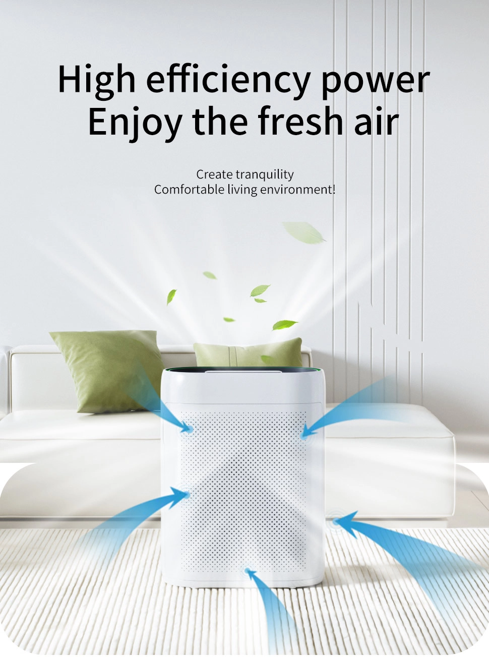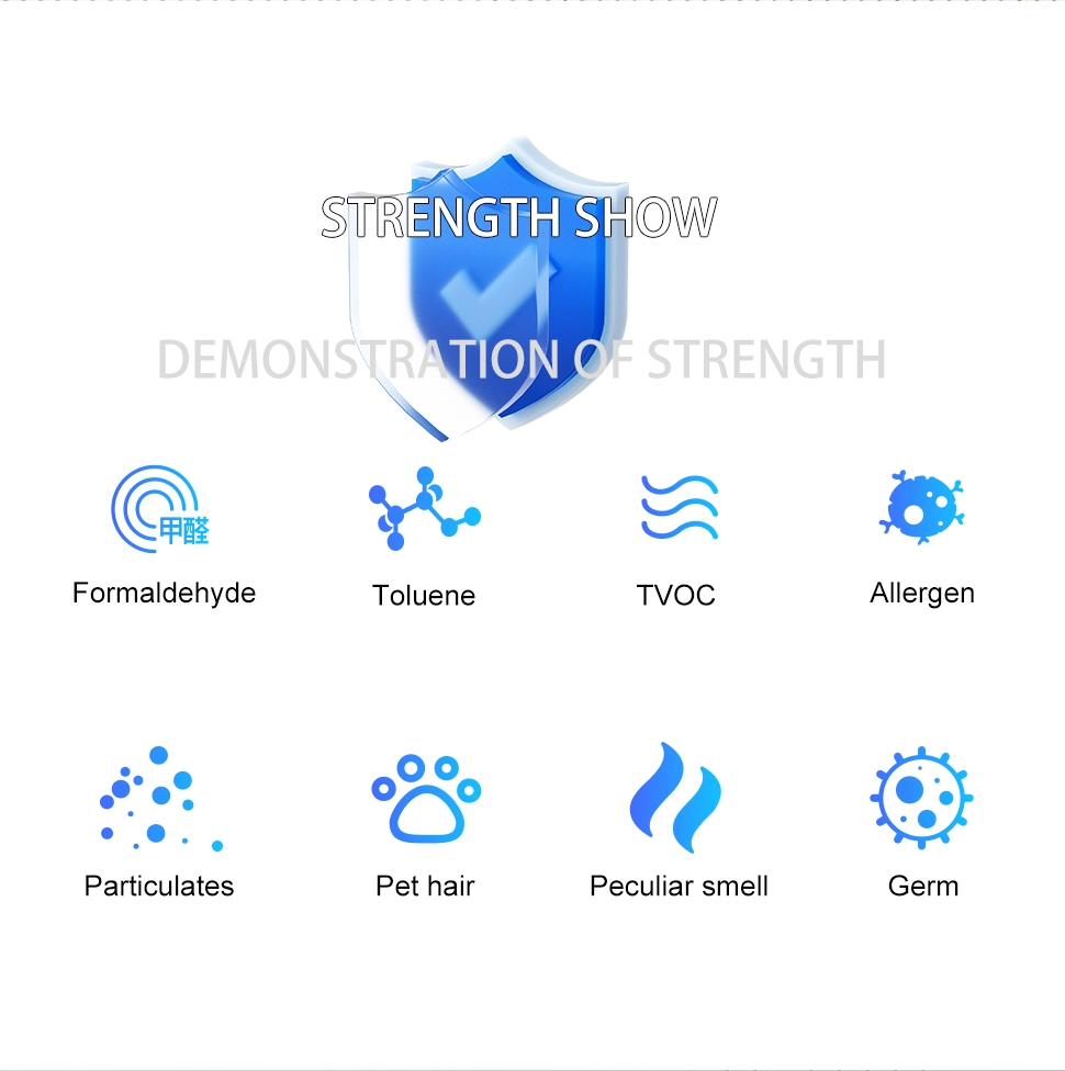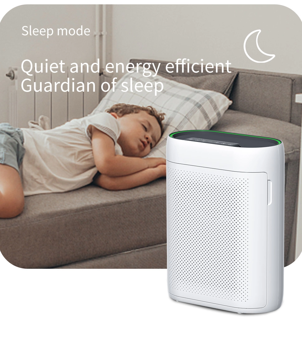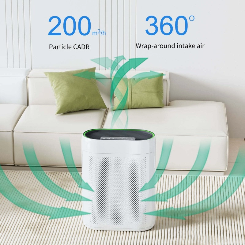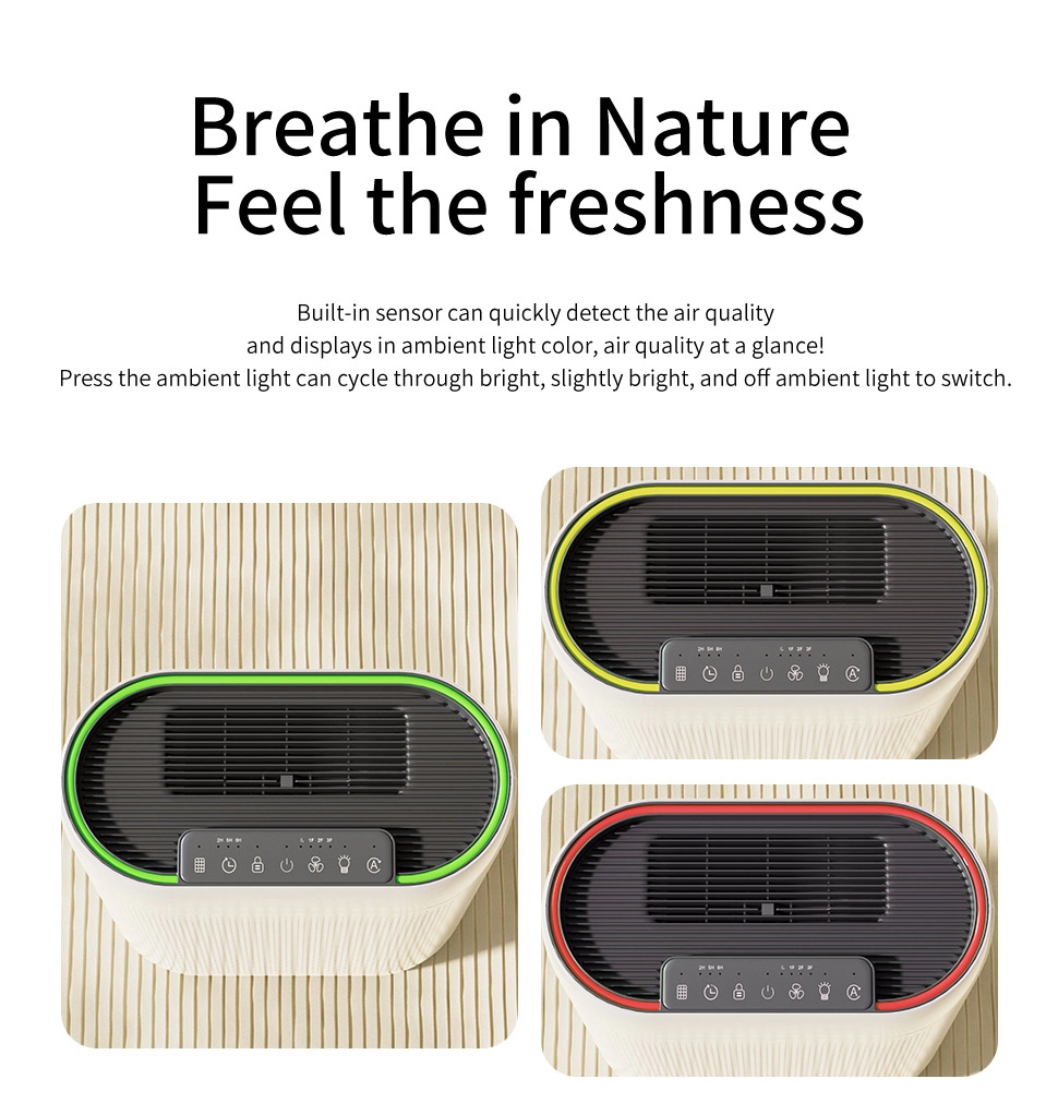 Our high-efficiency Smart Air Purifier combines advanced technology with exceptional performance. With a CADR of 200m³/H, it quickly filters air in 20-25㎡ spaces. The Air Quality Sensor (PM2.5 infrared) adjusts the fan speed for optimal performance, while the multi-layer filtration system (Pre-filter, HEPA, Activated Carbon) tackles allergens, odors, and VOCs.