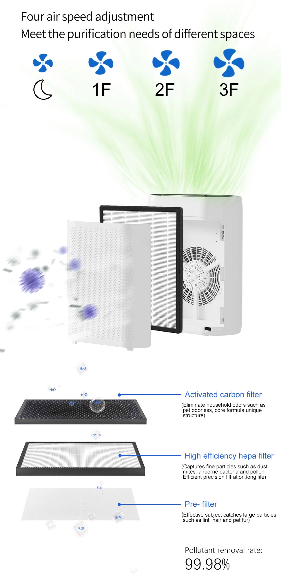 • 3 in 1 filters:Pre-filter & H13 HEPA filter& Activated carbon filter