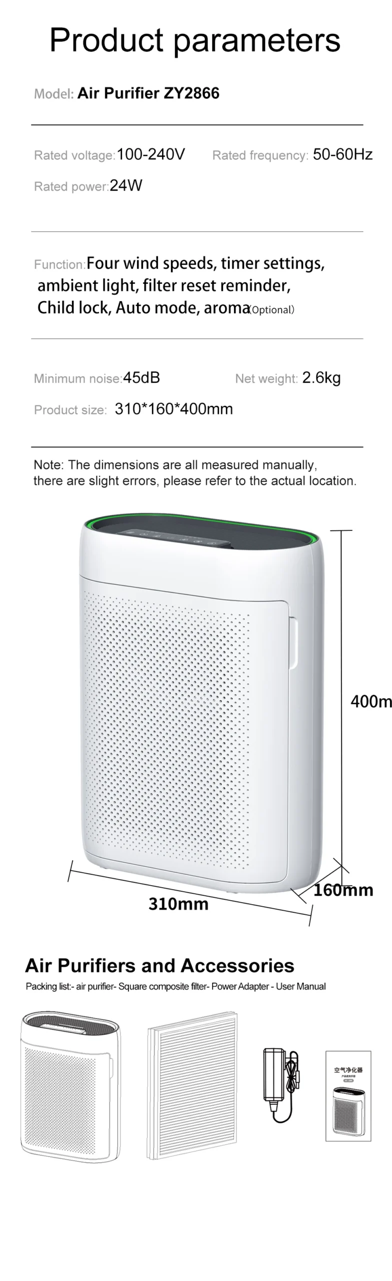 It runs on a DC24V 1A power supply, consuming only 24W for energy efficiency. Features include three fan speeds, Serene Sleep Mode (≤50dB), Child Lock, Timer, Filter Reminder, and Aromatherapy. Its compact design (310162400mm, 2.4kg) is portable, with optional WiFi connectivity for remote control via a smartphone app.